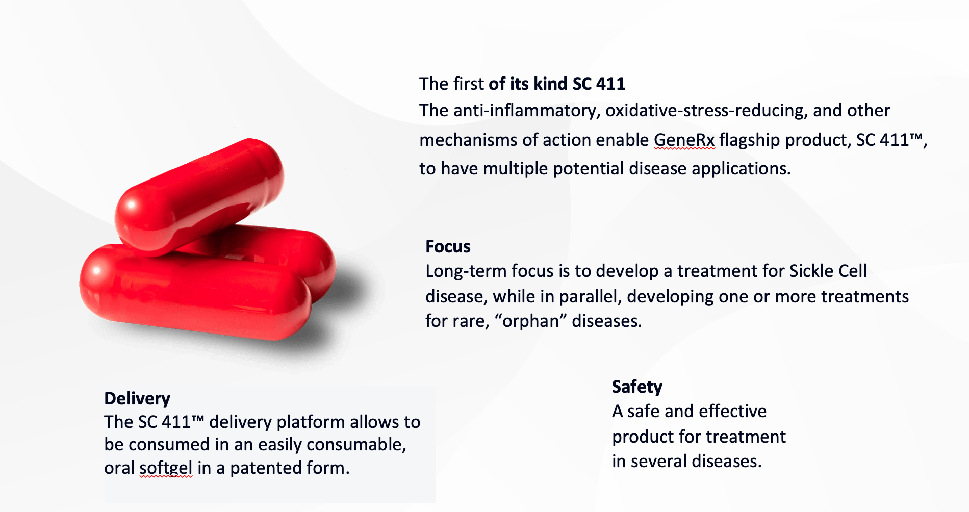 GeneRx, Inc. has developed the first and only Sickle Cell product that safely reaches therapeutic levels without GI-side effects creating treatment possibilities in many indications.